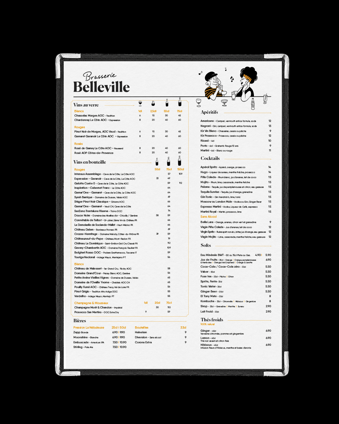 À la suite de cette collaboration, j’ai également eu le plaisir de concevoir toute l’identité visuelle de la brasserie : le logo, les menus, la signalétique extérieure et plusieurs supports imprimés. L’ensemble a été pensé en cohérence avec la fresque, en reprenant ses codes graphiques comme lignes continues, sobriété, détails dessinés à la main, … afin de créer une identité à la fois cohérente et vivante, fidèle à l’esprit d’une brasserie.